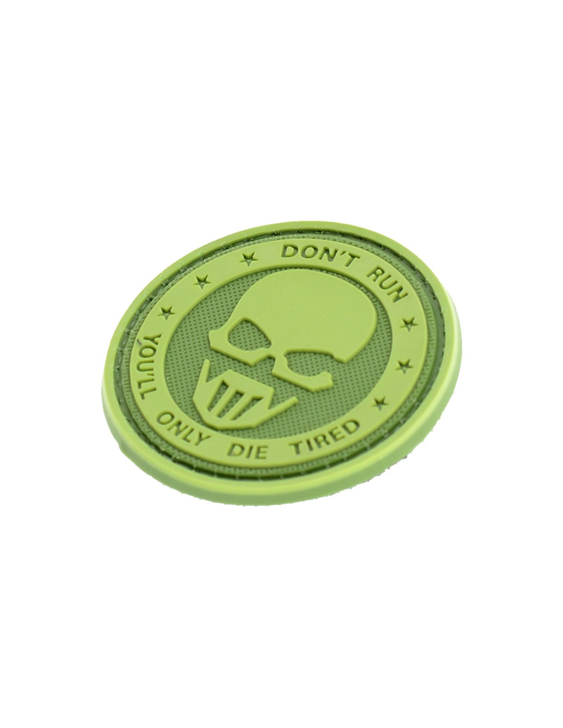 Don't Run You'll Only Die Tired è una patch realizzata in PVC di alta qualità, una gomma flessibile e duratura. La patch è realizzata in PVC per poter esprimere al meglio i dettagli del disegno rendendo un effetto 3D mai visto prima. In tutte le nostre patch viene utilizzato Velcro® originale Velcro® Brand Hook che viene cucito al PVC per garantire una massima durata nel tempo. Le nostre patch sono dotate di Velcro® maschio nel retro.